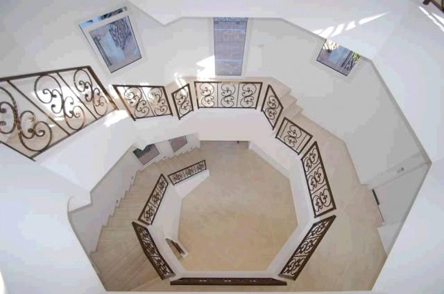 De villa is verdeeld over vier indrukwekkende verdiepingen en is bereikbaar via een privélift. De elegante architectuur wordt gecombineerd met royale binnenruimtes en een overvloed aan natuurlijk licht. De begane grond verwelkomt u met een statige hal die leidt naar verfijnde woonruimtes, waaronder twee elegante lounges, een formele eetkamer en een ruime, volledig uitgeruste keuken met hoogwaardige apparatuur en een aparte bijkeuken. Grote ramen en schuifdeuren geven toegang tot terrassen met een adembenemend uitzicht op zee, die naadloos aansluiten op de aangelegde privétuin met zwembad.