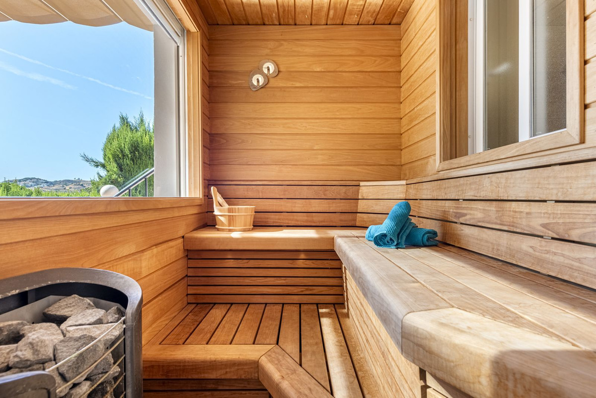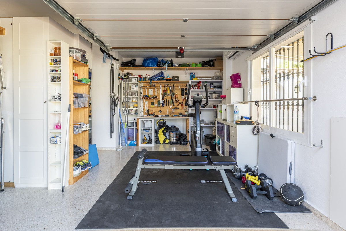 Er is ook een sauna met ingebouwde geluidsinstallatie en uitzicht op de tuin voor de koelere winterdagen. De garage, met elektrische deur en airconditioning, wordt momenteel gebruikt als fitnessruimte en handige opslagruimte. Extra parkeergelegenheid is beschikbaar op de oprit onder een praktische luifel.