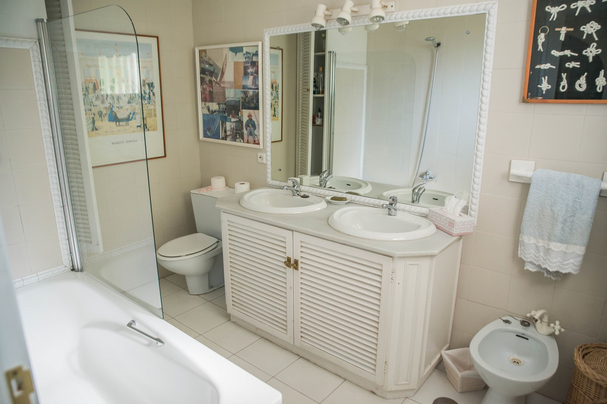 Op de begane grond bevinden zich de woonkamer en eetkamer, de keuken, een gastentoilet, twee slaapkamers met eigen badkamer en twee andere slaapkamers die een badkamer delen. Er is ook een gastenappartement met aparte toegang.
