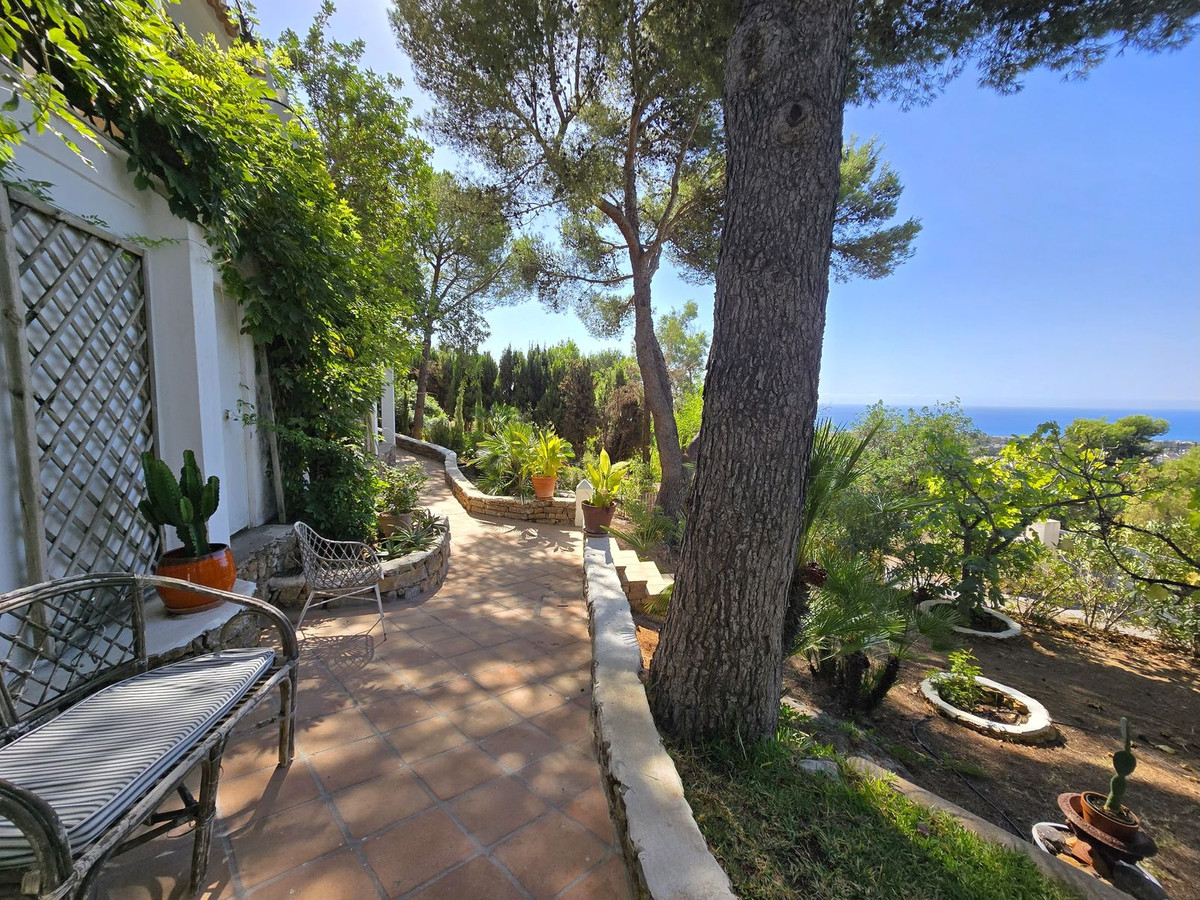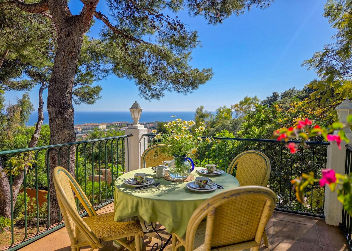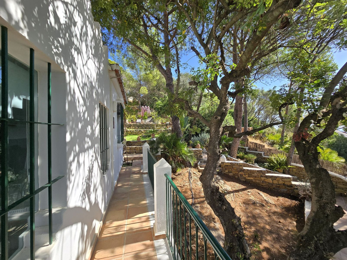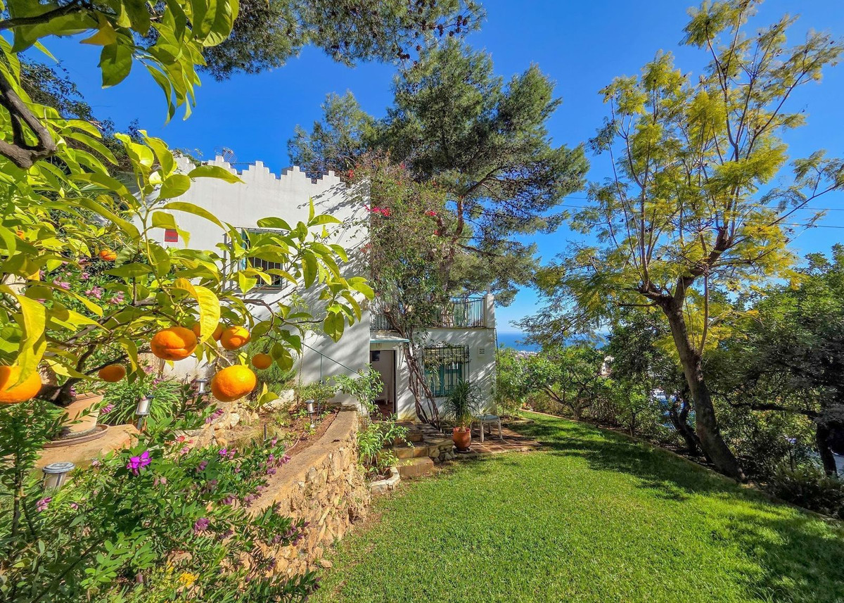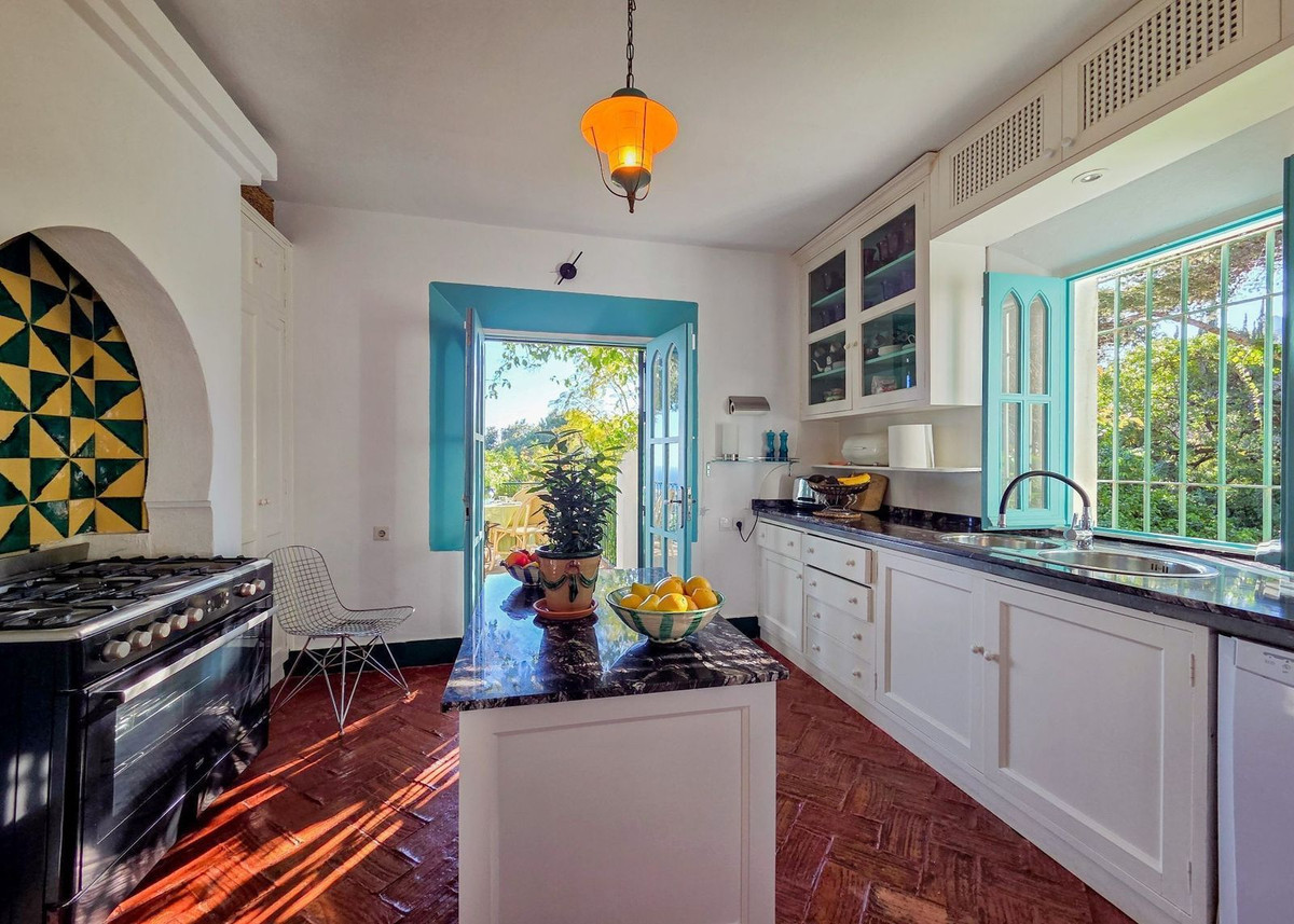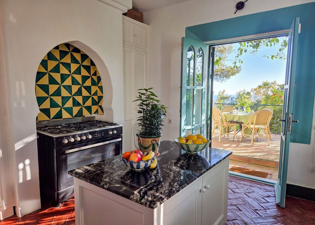 Binnen zet een gastvrije hal met schuine houten plafonds de toon voor het elegante interieur van het huis. Aan de linkerkant bevindt zich een lichte en luchtige woonkamer met open haard, die baadt in het licht, wat een warme en uitnodigende sfeer creëert. De keuken, vol karakter en levendige kleuren, komt uit op een indrukwekkend hangend terras met adembenemend uitzicht op zee, prachtig omlijst door bougainvillea en jacarandabomen – de perfecte plek om buiten te eten of gewoon te genieten van de mediterrane sfeer.