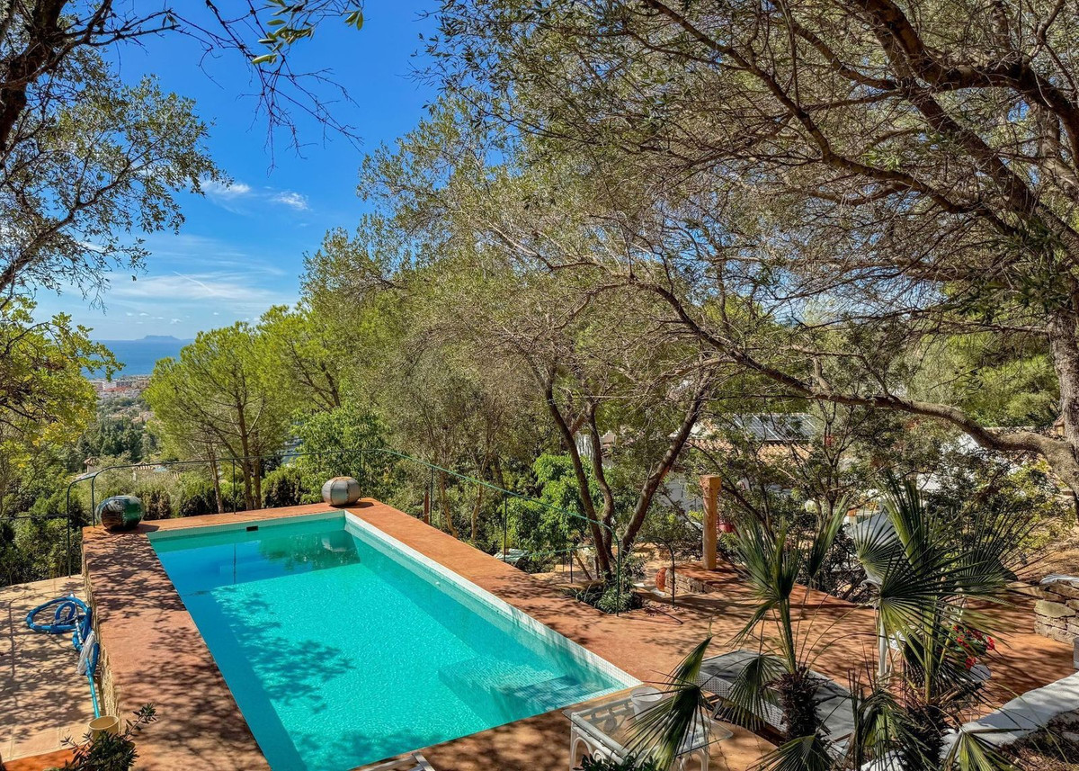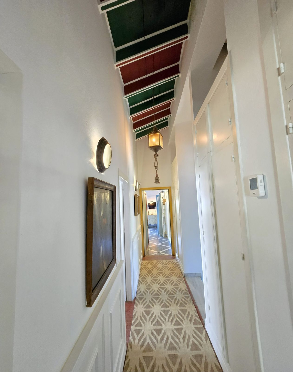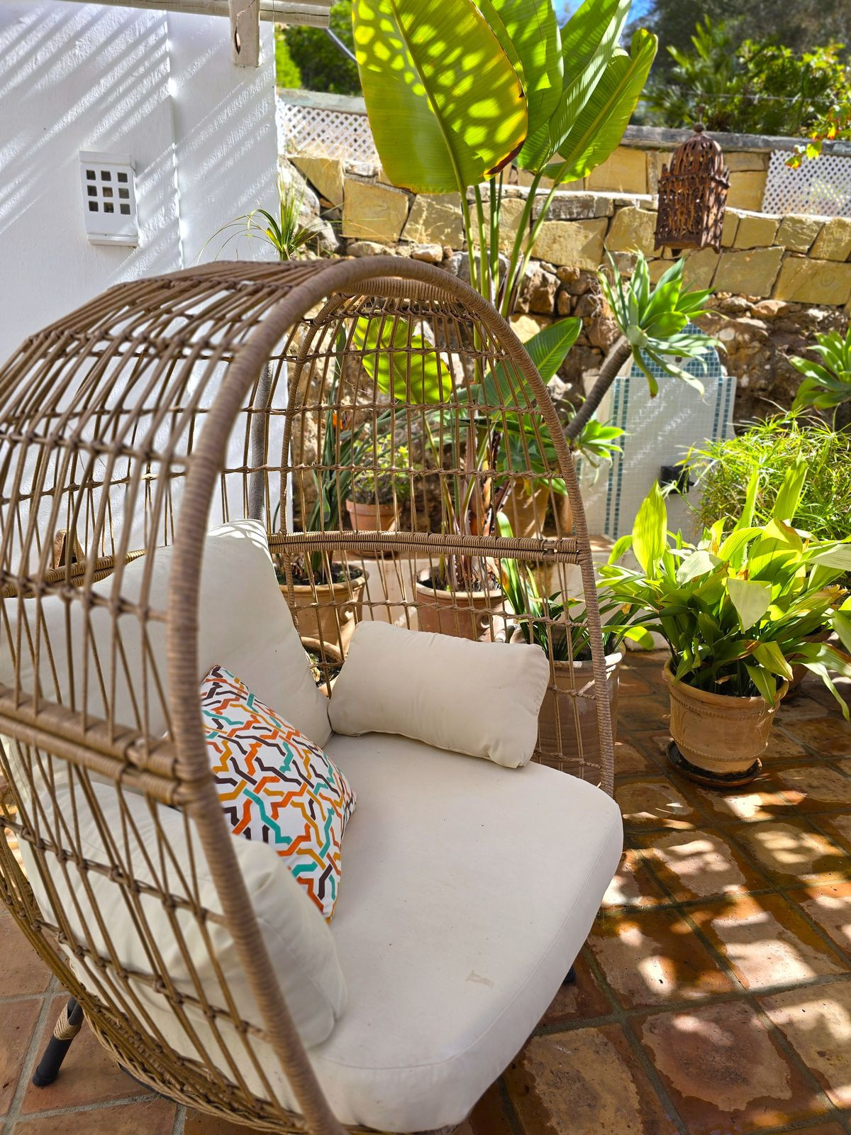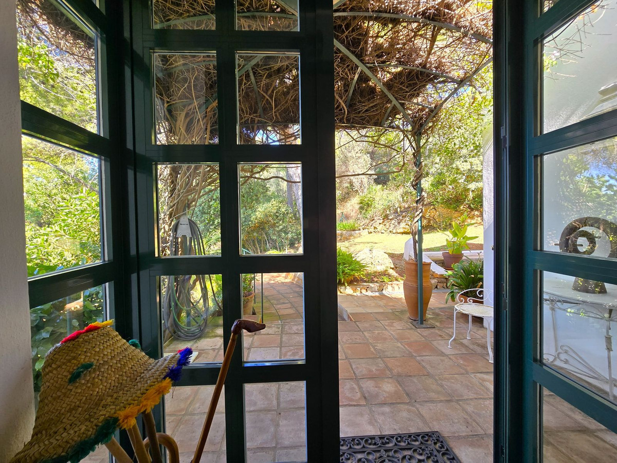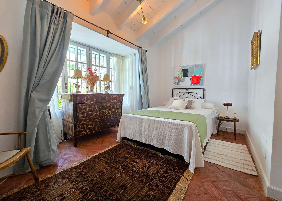 Binnen zet een gastvrije hal met schuine houten plafonds de toon voor het elegante interieur van het huis. Aan de linkerkant bevindt zich een lichte en luchtige woonkamer met open haard, die baadt in het licht, wat een warme en uitnodigende sfeer creëert. De keuken, vol karakter en levendige kleuren, komt uit op een indrukwekkend hangend terras met adembenemend uitzicht op zee, prachtig omlijst door bougainvillea en jacarandabomen – de perfecte plek om buiten te eten of gewoon te genieten van de mediterrane sfeer.