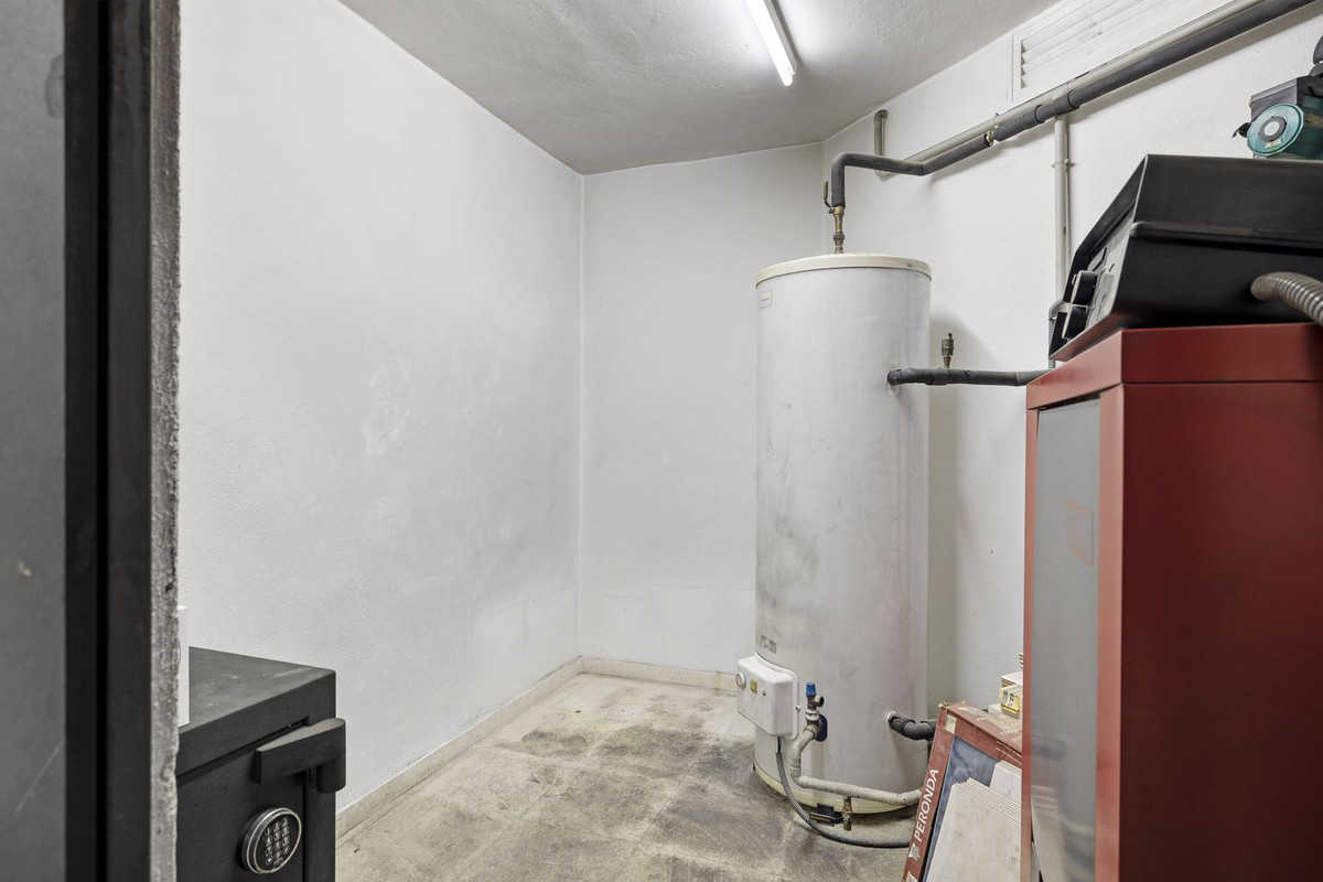 Outside, the beautifully landscaped garden with mature palms and a sparkling swimming pool provides the perfect spot to relax and enjoy the peaceful surroundings. The garage for two cars, ample storage rooms, and electric gate add convenience and security.