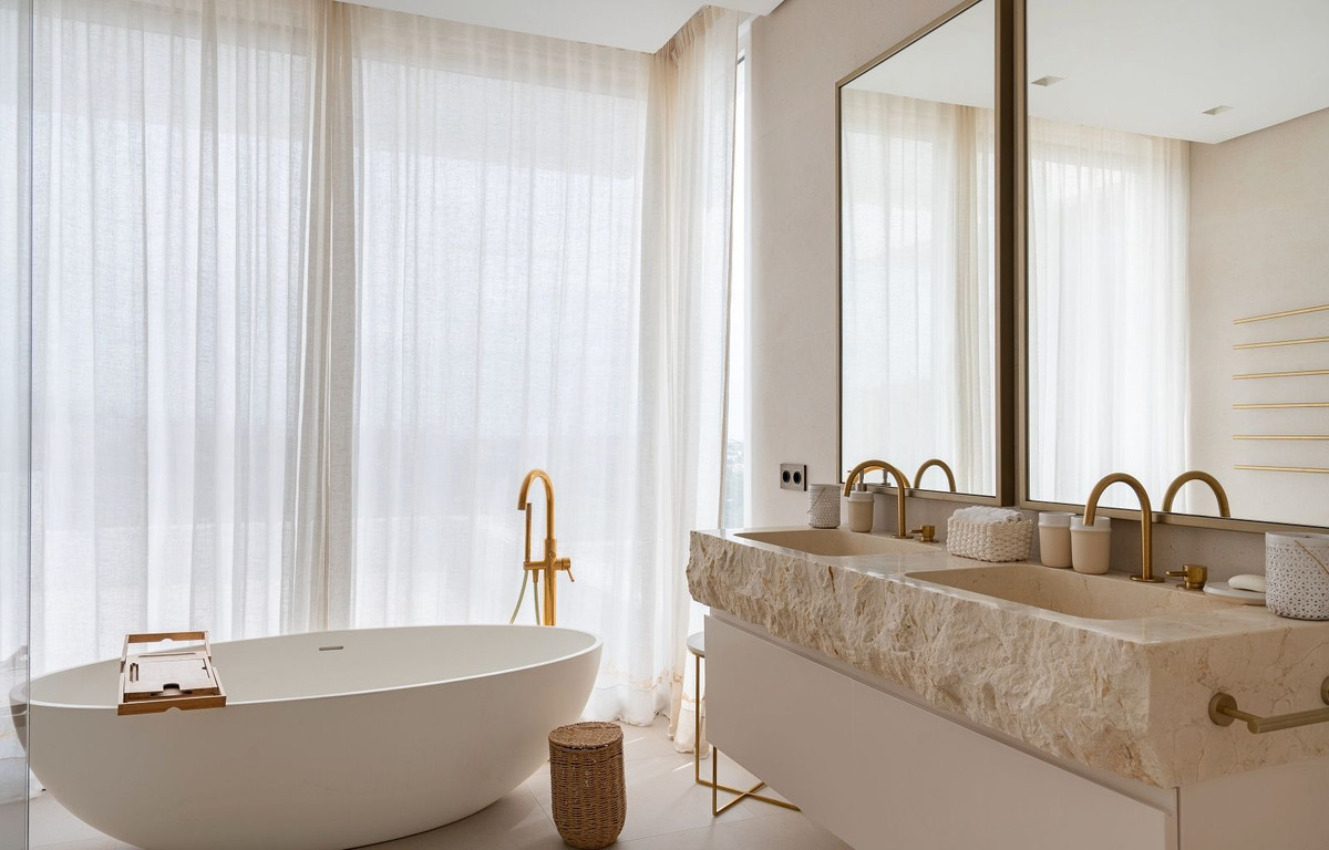 Op de eerste verdieping bevinden zich nog twee slaapkamers, waaronder de luxe hoofdsuite met twee inloopkasten en een ruime badkamer met zowel een inloopdouche als een vrijstaand bad. Beide slaapkamers bieden toegang tot een privéterras met panoramisch uitzicht op de zee, de golfbaan, La Concha en het omliggende landschap.