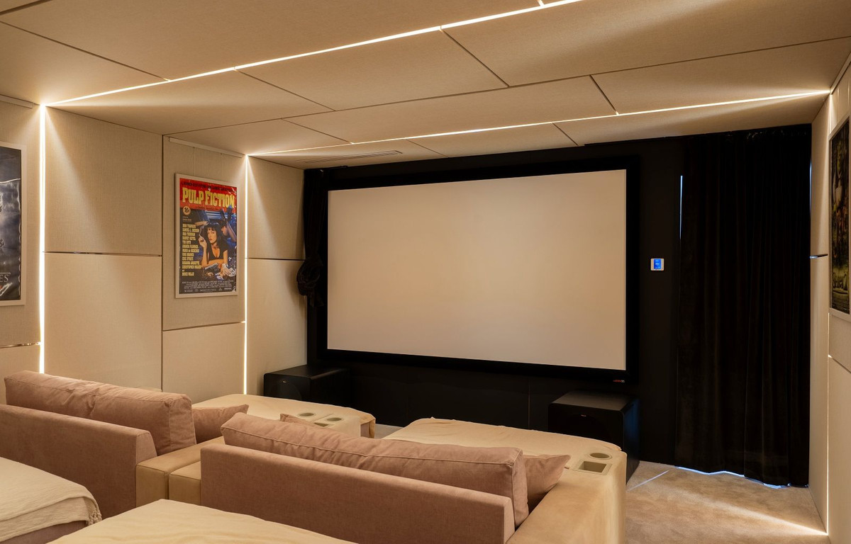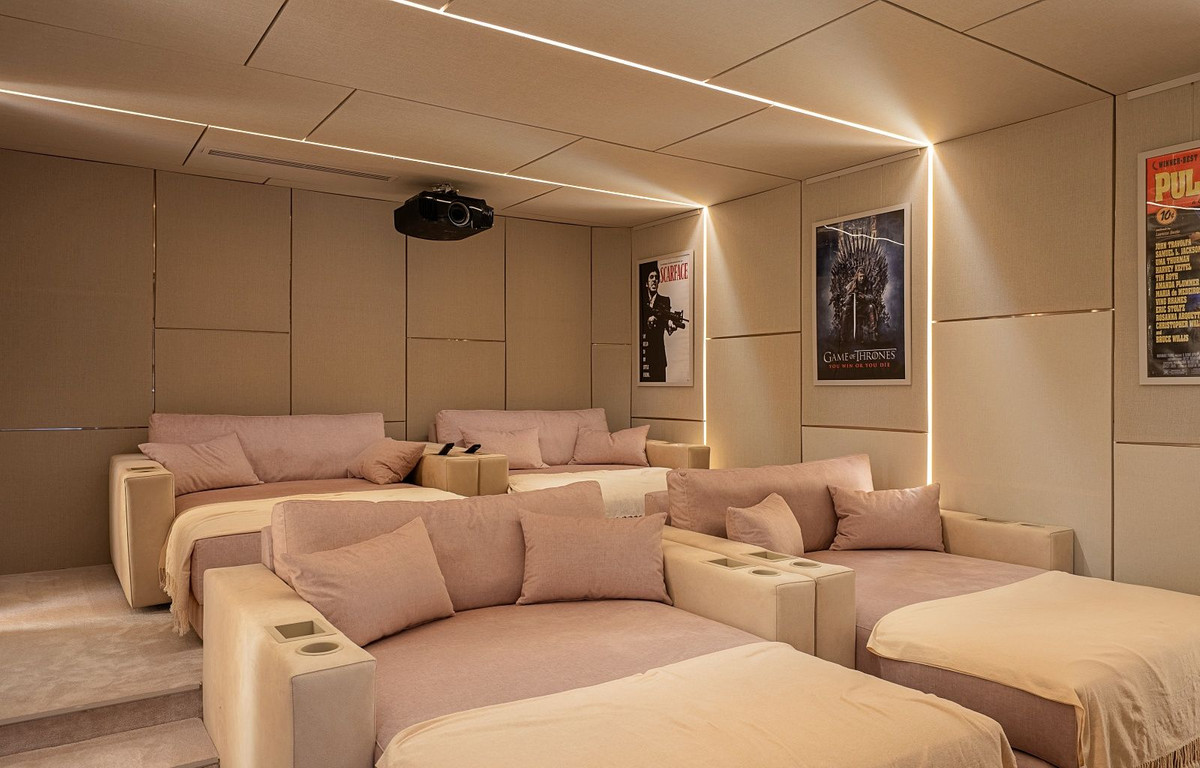 De benedenverdieping van de villa biedt een vierde slaapkamer met badkamer, aangevuld met diverse recreatieve faciliteiten. Deze omvatten een speelruimte, een indrukwekkende wijnkelder, een bioscoopzaal en een volledig uitgeruste fitnessruimte. Alle drie de verdiepingen van de woning zijn verbonden door een privélift voor extra gemak.