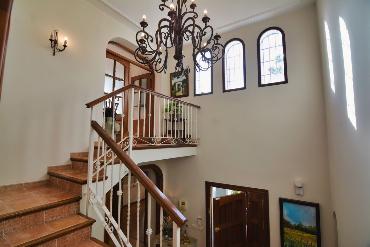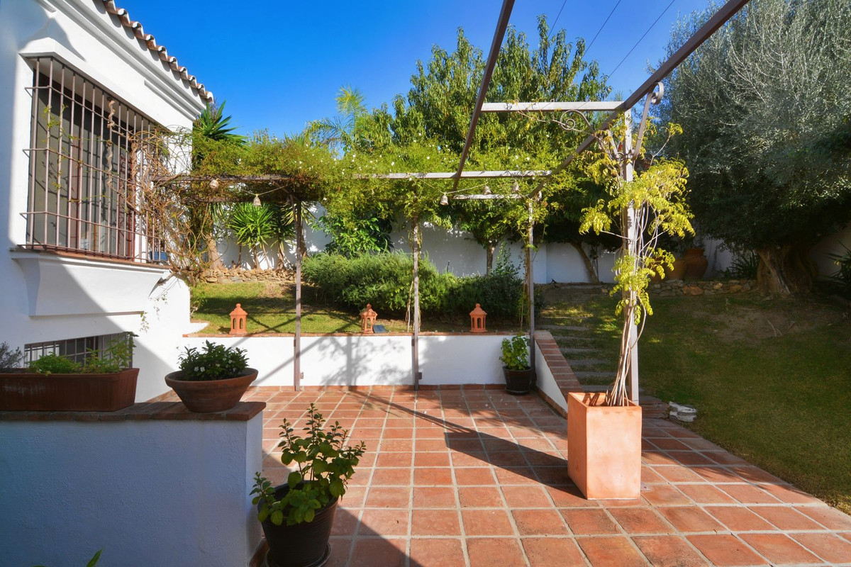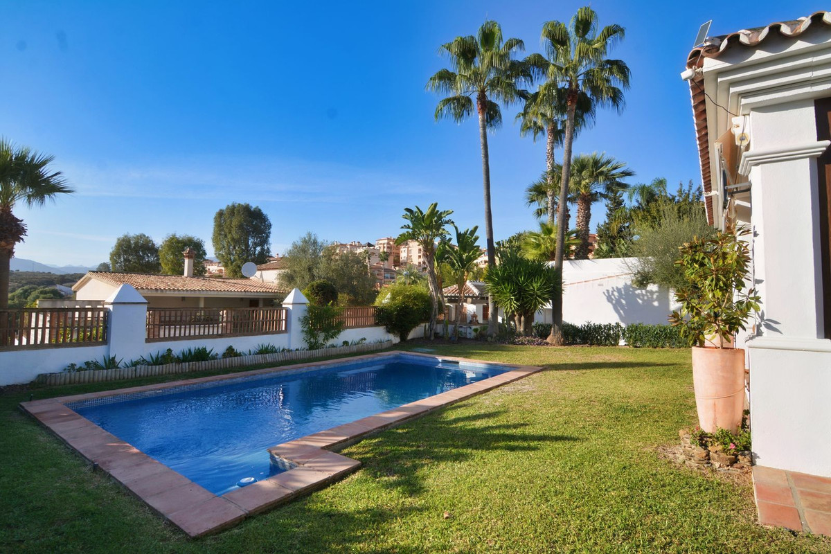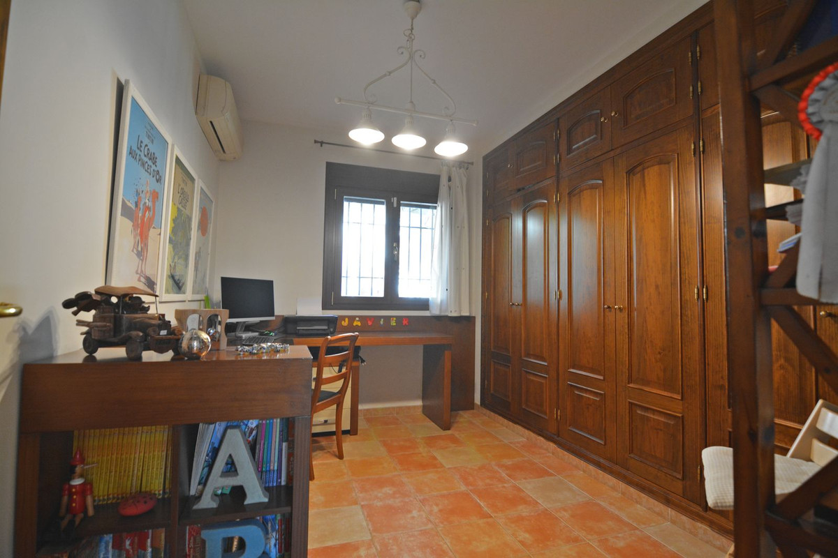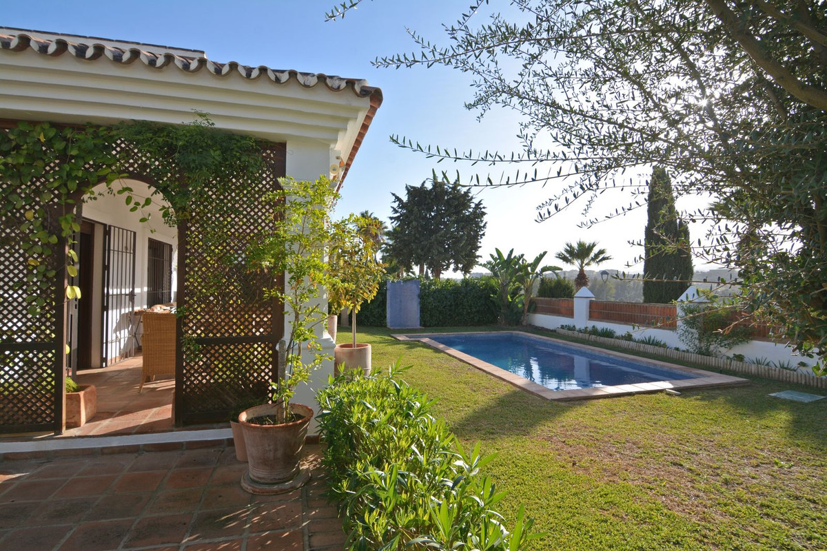 De woning staat op een perceel van 858 m² met een volgroeide tuin en een privézwembad, perfect om te genieten van het zonnige klimaat van de Costa del Sol. Op de begane grond vindt u een ruime en lichte woonkamer met directe toegang tot de overdekte veranda, waar u heerlijk kunt ontspannen en buiten kunt zitten. De aparte keuken is ruim en functioneel, met toegang tot een charmant terras aan de achterzijde, ideaal voor een ontbijt in de zon. Op deze verdieping bevindt zich ook een gastentoilet.
