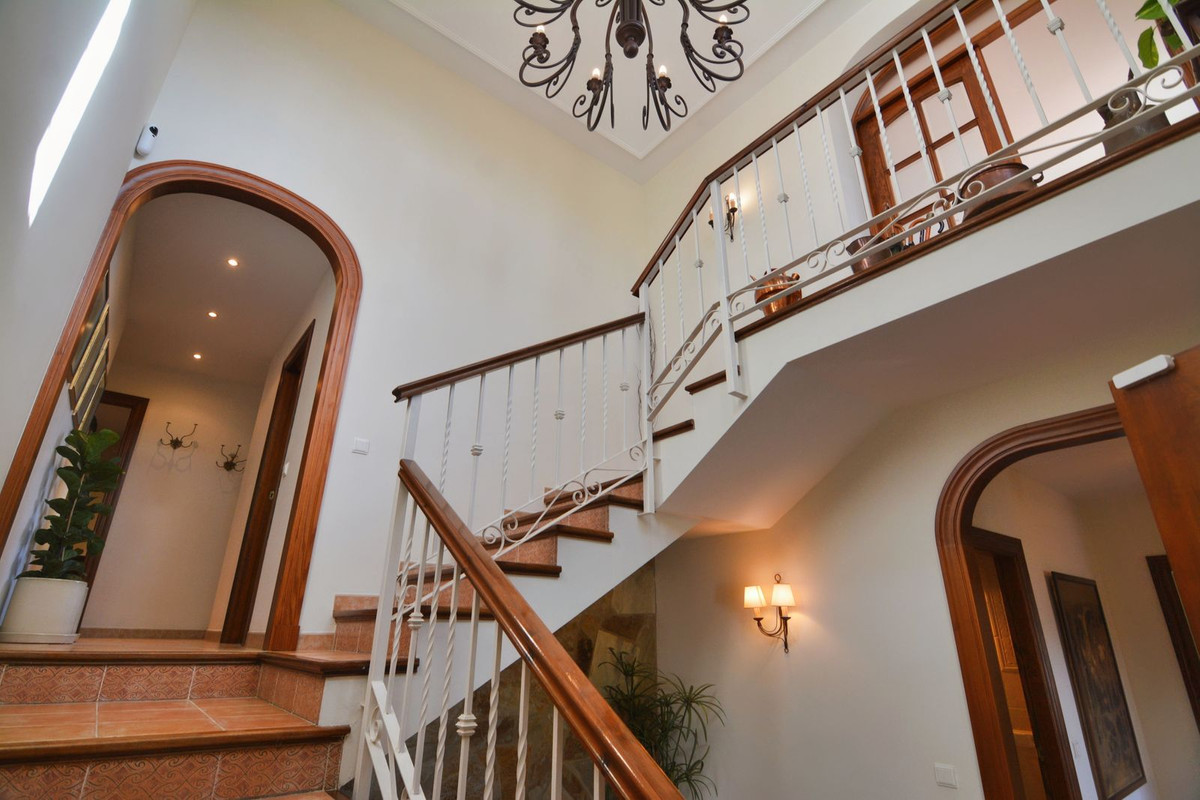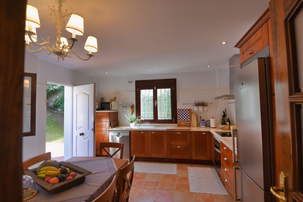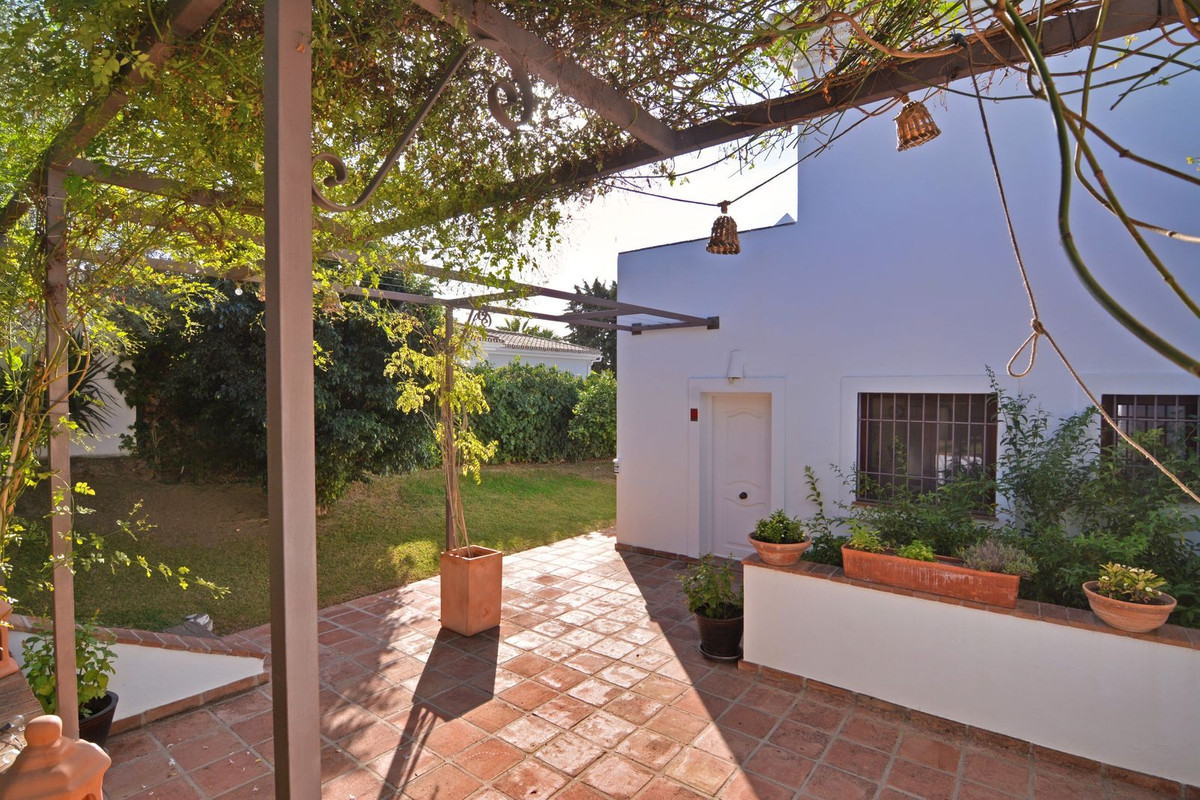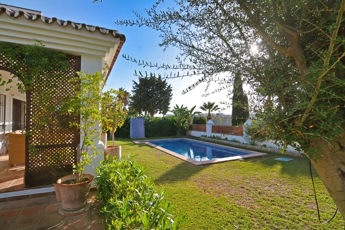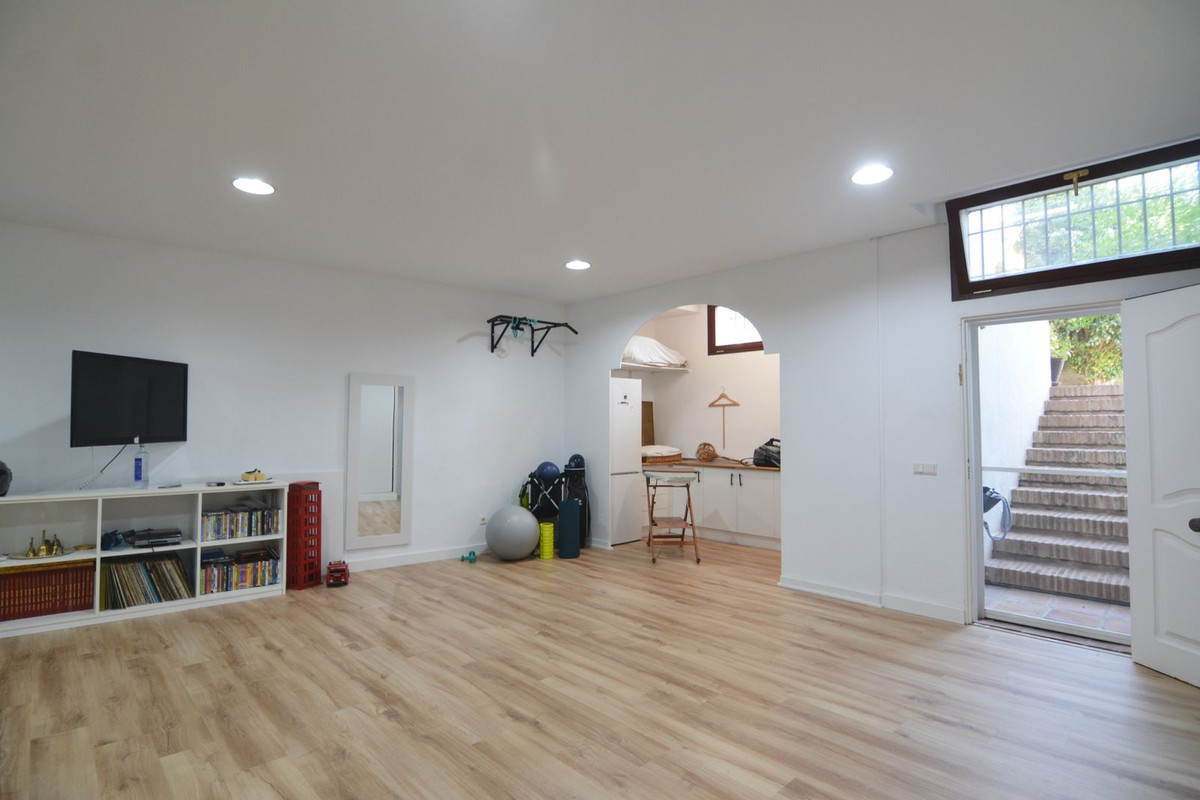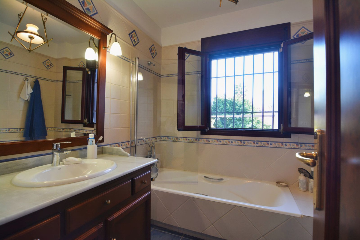 De woning staat op een perceel van 858 m² met een volgroeide tuin en een privézwembad, perfect om te genieten van het zonnige klimaat van de Costa del Sol. Op de begane grond vindt u een ruime en lichte woonkamer met directe toegang tot de overdekte veranda, waar u heerlijk kunt ontspannen en buiten kunt zitten. De aparte keuken is ruim en functioneel, met toegang tot een charmant terras aan de achterzijde, ideaal voor een ontbijt in de zon. Op deze verdieping bevindt zich ook een gastentoilet.