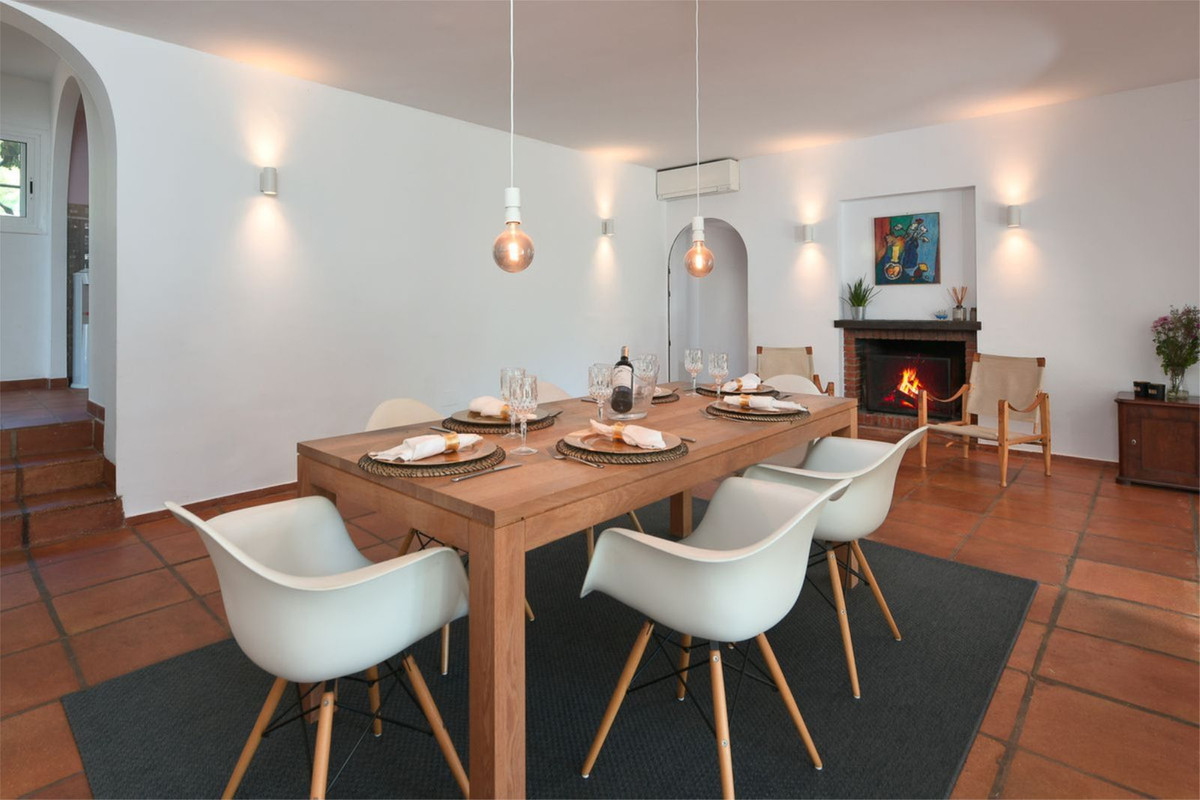 Deze prachtige villa in haciënda-stijl is gelegen in een rustige woonwijk van Artola Alta, vlakbij Cabopino. Het natuurreservaat Artola Dunes & Beach en Cabopino Beach & Harbour met zijn restaurants en supermarkten liggen op korte loopafstand. De villa bestaat uit drie slaapkamers en twee badkamers, twee woonkamers en een keuken met bijkeuken. De indeling is functioneel en gelijkvloers, waardoor privacy gegarandeerd is doordat de master bedroom & badkamer gescheiden zijn van de gastenslaapkamers & badkamer door de woon- en eetkamer. Het huis is omgeven door een muur en biedt veel privacy. De woning is vanaf de straat aan de noordzijde toegankelijk via een poort die naar de patio leidt. Vanuit de patio is er toegang tot een dubbele garage en een overdekte entree. Vanuit de entree komt u in een volledig uitgeruste keuken en een ruime eetkamer. Vanuit de woonkamer, die ook toegang biedt tot een overdekt terras, opent het huis zich naar de tuin en het zwembad. Het zwembad is omgeven door een weelderige, volgroeide tropische tuin met diverse fruitbomen. De woning beschikt tevens over een dakterras van 20 m2 waar u kunt genieten van het uitzicht op zee en de zonsondergang boven de baai van Marbella en de berg La Concha.