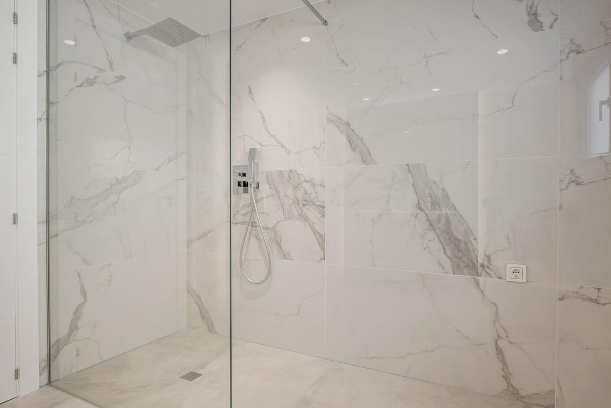 Eerste verdieping: 84m2, bestaande uit 2 slaapkamers (hoofdslaapkamer met terras van 17m2) en een kleedkamer, beide met eigen badkamer en inbouwkasten.