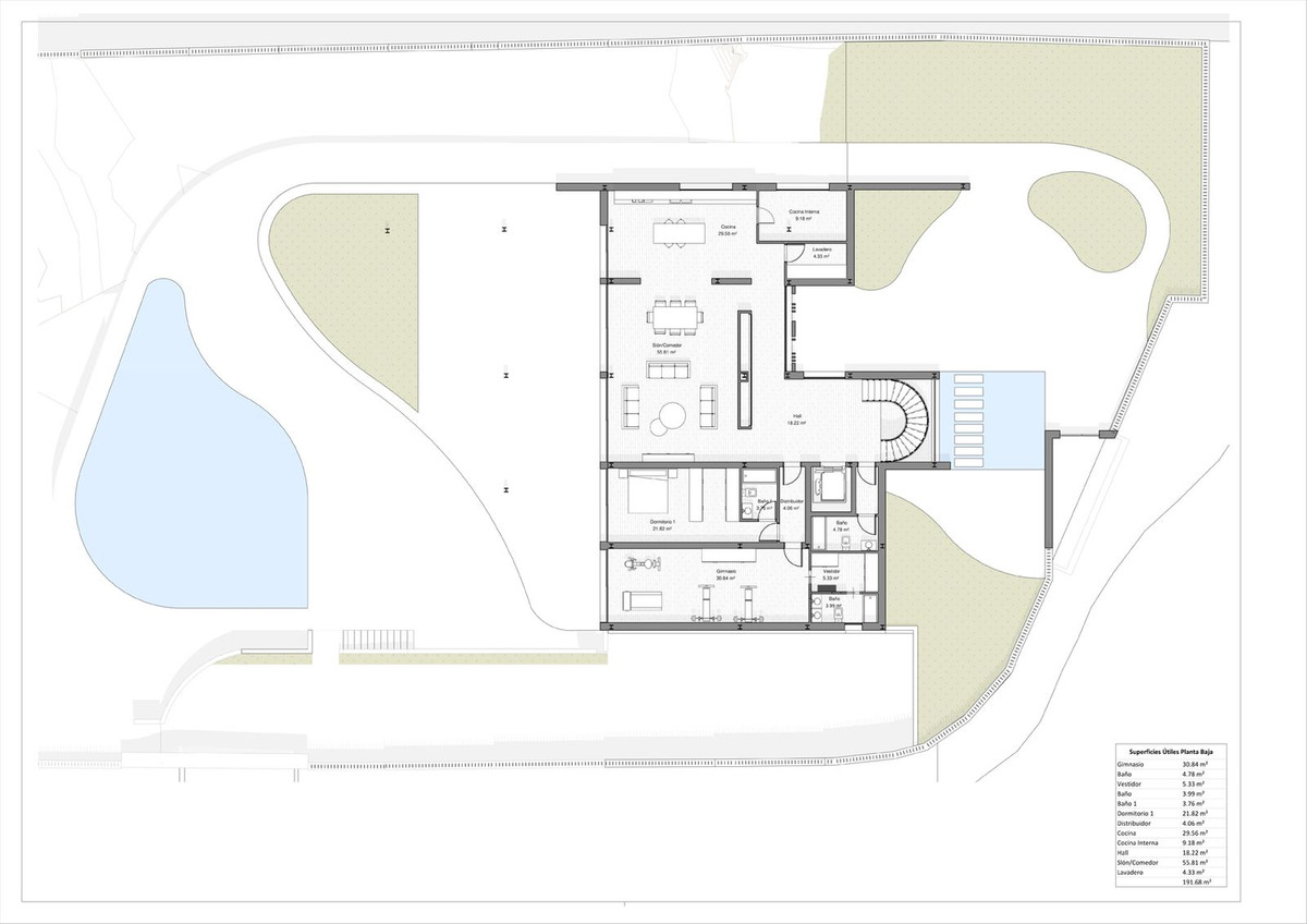 Het project omvat vijf grote slaapkamers, waaronder een royale master suite, diverse woonruimtes, een privé-fitnessruimte, servicevertrekken en een elegante centrale trap als belangrijk architectonisch element.